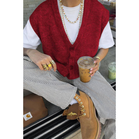 The Solid V Neck Sleeveless Knitted Cardigan Vest adds effortless sophistication to your layered looks. Crafted from a soft wool-blend fabric, it provides gentle warmth with a smooth finish. The sleeveless design and V-neckline offer a modern, tailored silhouette perfect for styling over shirts or dresses. Lightweight yet cozy, it transitions seamlessly between seasons. A timeless piece that brings understated polish to any outfit.