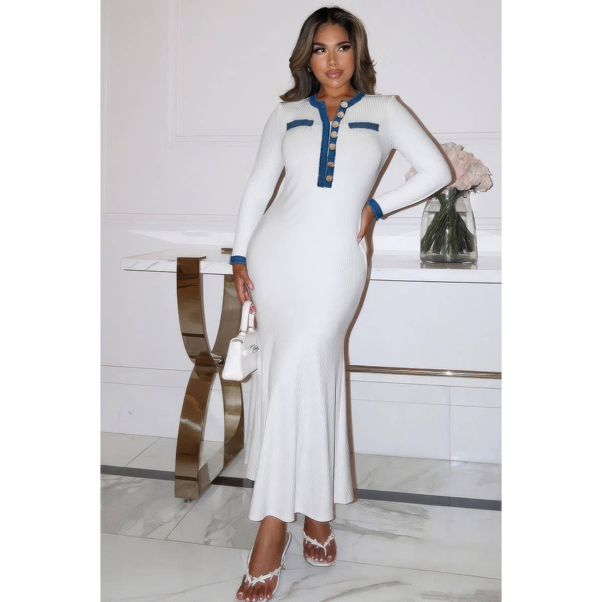 Contrast Trim Round Neck Long Sleeve Fit Dress