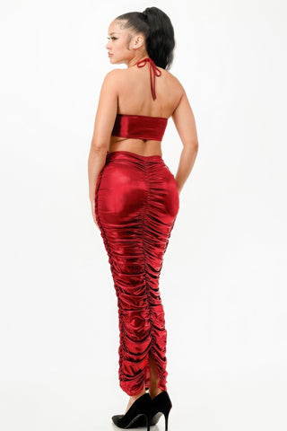 Make a bold statement with our Valentine's Metallic Rushed Halter Dress. Add it to your cart now and embrace the allure of fashion and elegance!